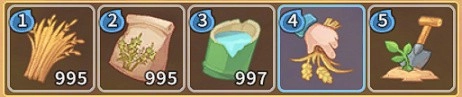 首先,玩家会在背包里单独有一个种植工具的套装,打开套装之后,会出现5个不同功能点的图标。这是我们设计的操作方式优化,不然玩家要频繁地在快捷栏里拖放种植的全部东西,用完又要换回来很麻烦。