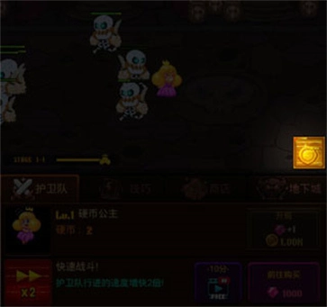 2、此外,为了让玩家操作更便捷,将上述画面向下滑动会空出一块区域,我们称之为控制区。点击控制区就能让硬币公主持续产出硬币,收集这些硬币后,玩家可以用来让勇士们不断升级,或是招募更多勇士来守护硬币公主,以此防止硬币公主被抓走。同时,升级硬币公主还能获得宝石作为奖励。