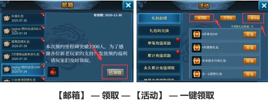 1. 如何正确领取礼包?邮件中领取到的是一个宝箱,需要到活动中打开宝箱,就能将物品收入背包!