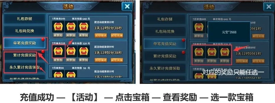 充值完成后,单笔充值对应的参与按钮就会亮起,但要注意!奖励只能选一个宝箱哦!建议先点击宝箱查看里面的奖励内容,确定想要的再选择~(别忘了还有月礼包和永久礼包可以领取)