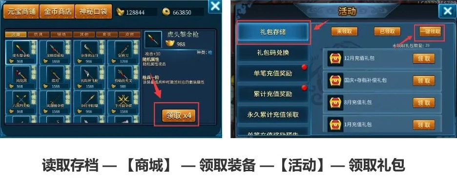 读取不同的存档,要记得前往【商城】【活动】中领取购买过的装备和礼包!