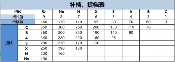 成长档位分别为:极-160、NX-130、N-110、X-95、S-80、A-70、B-60、C-0、一共八档。