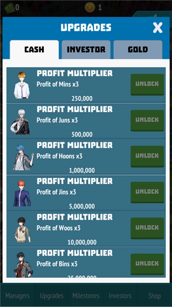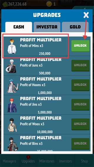 4、进入【UPGRADES】中的【CASH】页面后,建议优先解锁那些花费较低但回报较高的升级选项,比如【MIN】的利润×3这一项。花费25万解锁该升级后,能够显著提高对应偶像的收益,从而加快资金积累的速度。