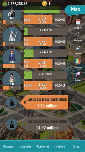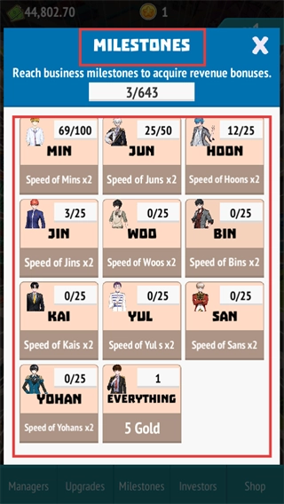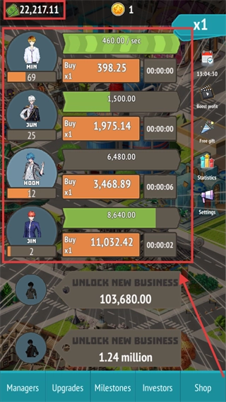 1、点击偶像对应的【Buy】按钮,可对【MIN】【JUN】【HOON】【JIN】等偶像进行升级,以此提高每秒收益;积累足够资金后解锁新业务,并逐步扩大偶像团队规模,进而增加整体总收益。