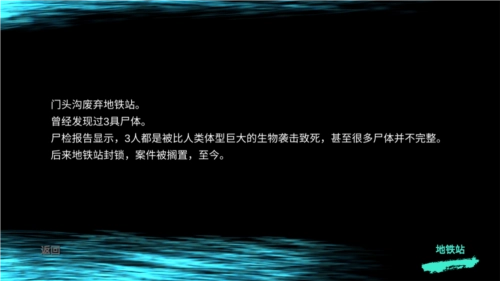 冯跃进是孙美琪系列里一个有趣的DLC剧情,这款游戏同样需要玩家展开冒险闯关。在完成此前的案件后,玩家还得继续推进其他案件,全新的故事正等待着大家去探索。故事发生在门头沟的废弃地铁站,这里曾发现过三具尸体。尸检报告表明,这三人都是遭到体型比人类庞大的生物袭击而死亡,不少尸体甚至残缺不全。后来地铁站被封锁,这起案件也被搁置,一直到现在都没有进展。