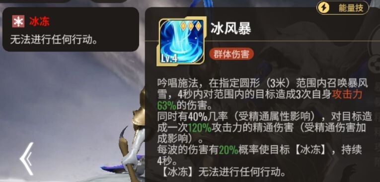 出伤方式是持续范围伤害(且冰冻目标造成更高伤害,小技能伤害受暴击率影响)。