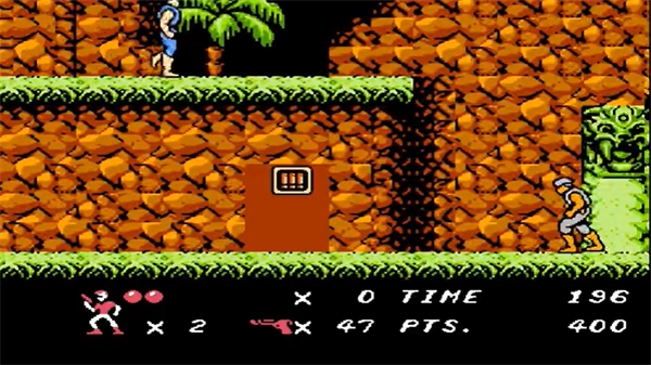 这一关的后半部分难度陡然上升,墙壁会不断掉落烧瓶;穿过树林时,绿衣士兵会接连冒出来,这时得赶紧往右跑,等他们都凑过来后再一起解决掉。最棘手的是终点附近出现的老鹰,它会和射手形成左右夹击的局面——要是反应不过来就马上蹲下;要是还能移动,就尽量往左边挪,毕竟射手在屏幕外不会开枪,就算移动时被老鹰撞到也没关系,反正过关后血量会自动补满,但要是被射手击中,基本就没救了。另外,通关之后会给你一个续关密码。