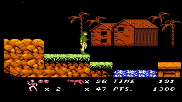 本关流程:第一关难度比较简单,但要熟练掌握操作,按【↑+A】可高跳,但不能同时射击,高跳时也不能向两侧移动。从高处落地前也不可射击。主角只能朝左右射击,作为一款1990年的作品,这个操作也太不亲民了,真应该和《魂斗罗》好好学学。