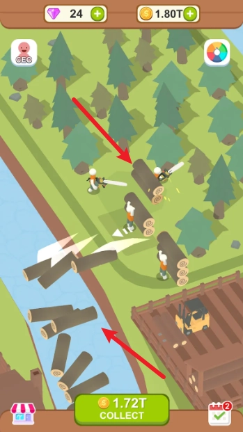 1、游戏开始后,我们要安排工人去森林里砍伐树木,再把砍好的树木投进小溪里让水流运送。