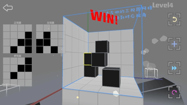 第一关:就是按照左视图、俯视图、正视图这三个方向,来放置方块。