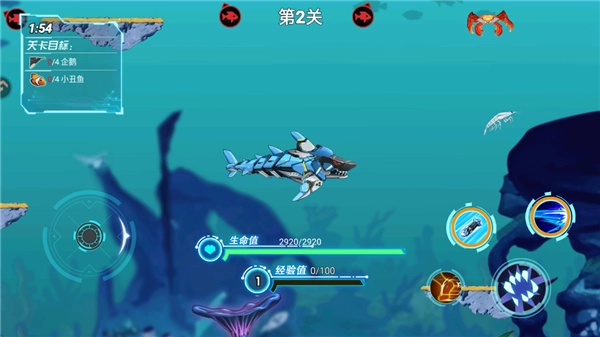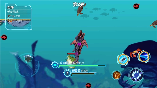 6、你可以移动通过咬键吃其它海洋生物,不要碰到有毒生物会损失血量;