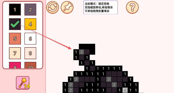 2、在左侧的数字面板里选定编号4,接着留意右侧像素区域内所有标记为4的格子,随后用单指拖拽的方式连贯地填涂这些格子,在此过程中要特别注意边缘位置的格子,防止填涂时溢出到编号1的区域。