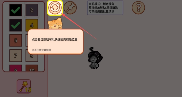 4、左上角的勾选框会显示已完成的编号,若填色出现错误,点击顶部的黄色重置按钮就能快速回到初始状态;使用单指拖拽的方式,可以批量填涂相同编号的区域。
