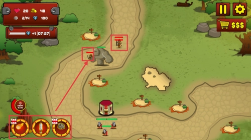2、在战斗准备界面消耗初始金币,在敌军必经路线建造2座基础箭塔。