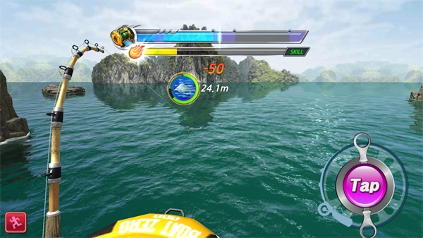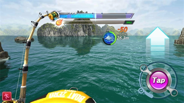 4、点击tap按钮,让上方的进度条维持在紫色区域,以此来积累能量;等能量积满后,向上滑动就能释放技能,从而对鱼造成更高伤害,降低其血量。