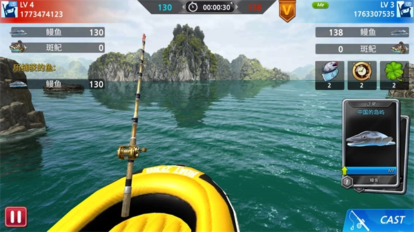 7、比赛开始后点击cast开始钓鱼,玩家钓到指定鱼类即可获得积分,比赛时间结束时,积分更高的玩家将赢得胜利。