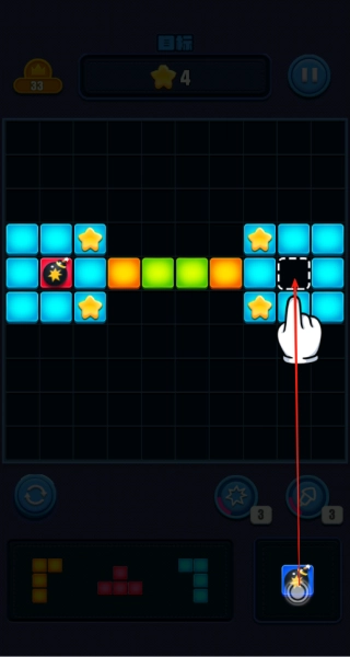 3、将炸弹道具拖入空缺区域,可引发范围爆炸消除周边大片方块。