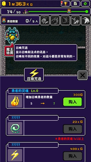2、点击召唤咒语,可以解锁各种咒语,增加召唤勇者的数量