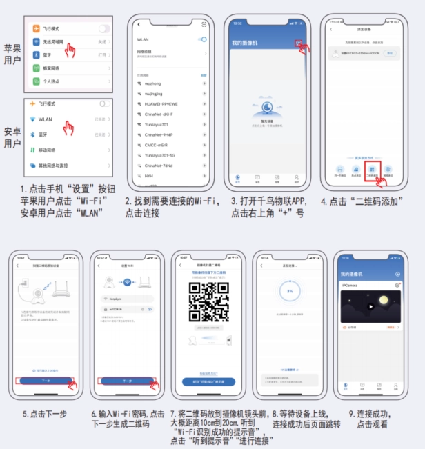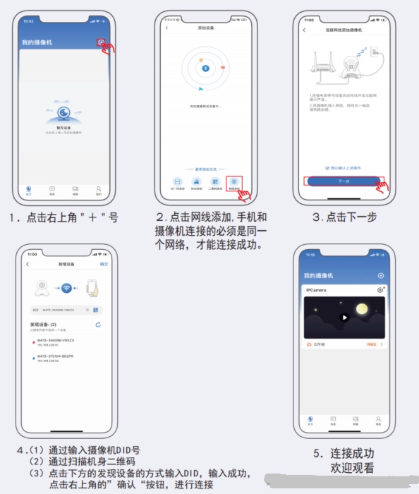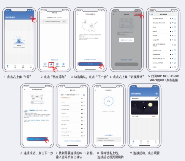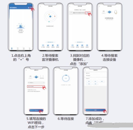 步骤:先给摄像机接通电源,再让手机连接上WiFi。等摄像机发出配网通知后,按照以下操作进行。