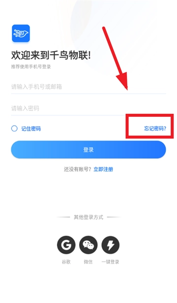 在本站安装并打开千鸟物联,进入登录界面后点击忘记密码