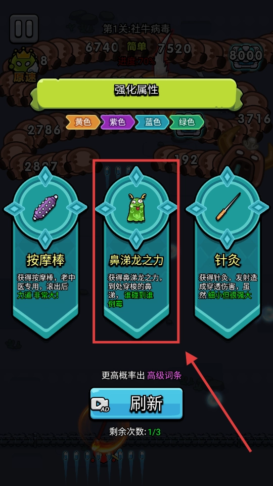 1、选择【鼻涕龙之力】,其穿梭的鼻涕碰到敌人会使其倒霉,可有效清理周围病毒。