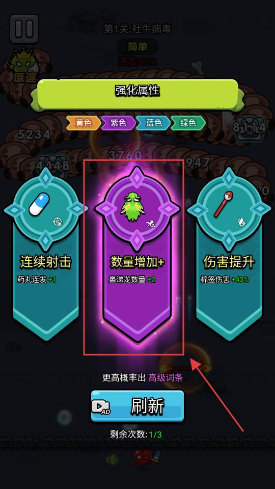 3、强化阶段选择【数量增加+】,能让鼻涕龙的数量增加2只,进而提升其攻击频率与范围,有效增强清场效果。