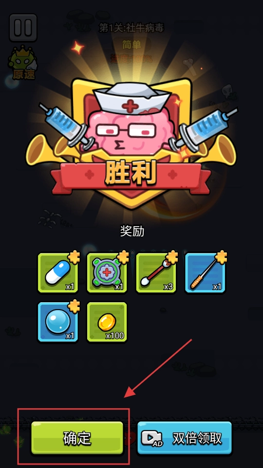 4、在关卡获胜之后,点击【确定】按钮来领取奖励,所获得的道具能够用来强化角色,从而提升后续的战斗能力。