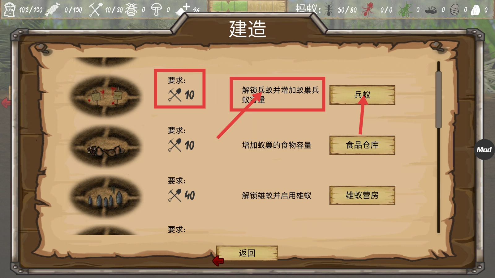 2、在建造界面,凑齐【10】工具,建造兵蚁建筑,解锁兵蚁并增加其容量,提升蚁群作战与防御能力。