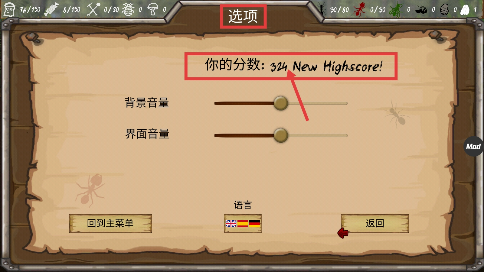 4、进入【选项】界面后,查看显示的【你的分数:324-New-Highscore!】,记录下该成绩,之后可以根据需要调整音量或语言设置,以便继续挑战更高分数。