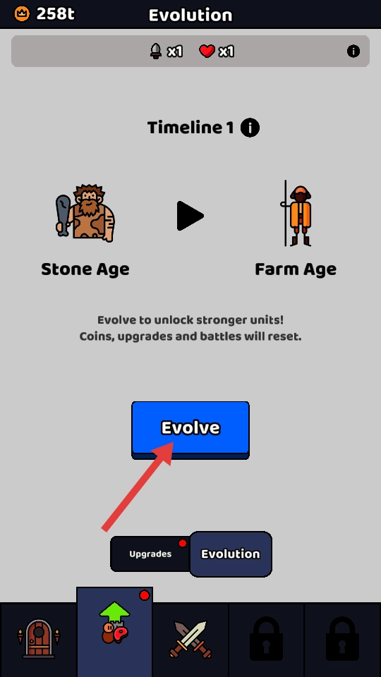 4、点击【Evolve】进化,解锁更强单位,重置金币、升级和战斗进度,开启新的游戏阶段。