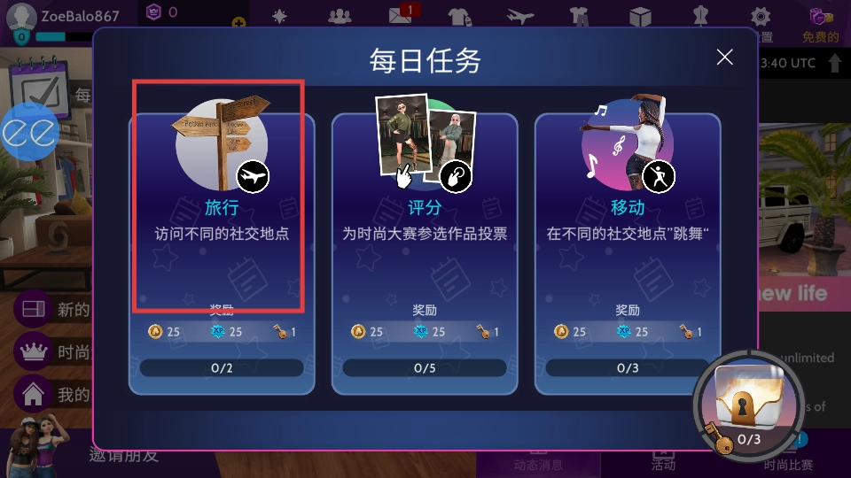 4、完成每日任务【旅行】,访问不同社交地点,获取奖励,提升角色等级和资源。