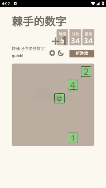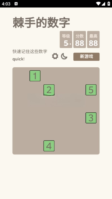 《棘手的数字小游戏》是一款锻炼玩家瞬间记忆能力的益智佳作。游戏难度会根据玩家的操作动态调整,随着关卡推进,出现的数字数量逐渐增多,挑战也随之升级。在游戏过程中,所有格子里的数字会在不到一秒的短暂时间内显示,玩家需要做的就是按顺序找出这些格子——规则听起来简单,实际玩起来却极具挑战性。
