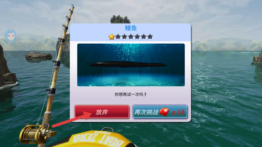 4、若钓鱼失败,可选择【放弃】,再次尝试钓起鳗鱼。