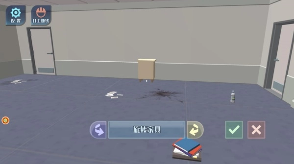2、前往房间清理杂物与墙壁污渍,完成基础清洁工作。