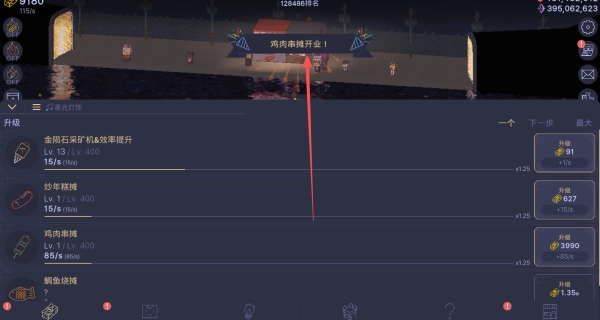 4、升级之后,比如我们后续可以解锁更多的摊位,比如炒年糕,或者是鸡肉串等等。