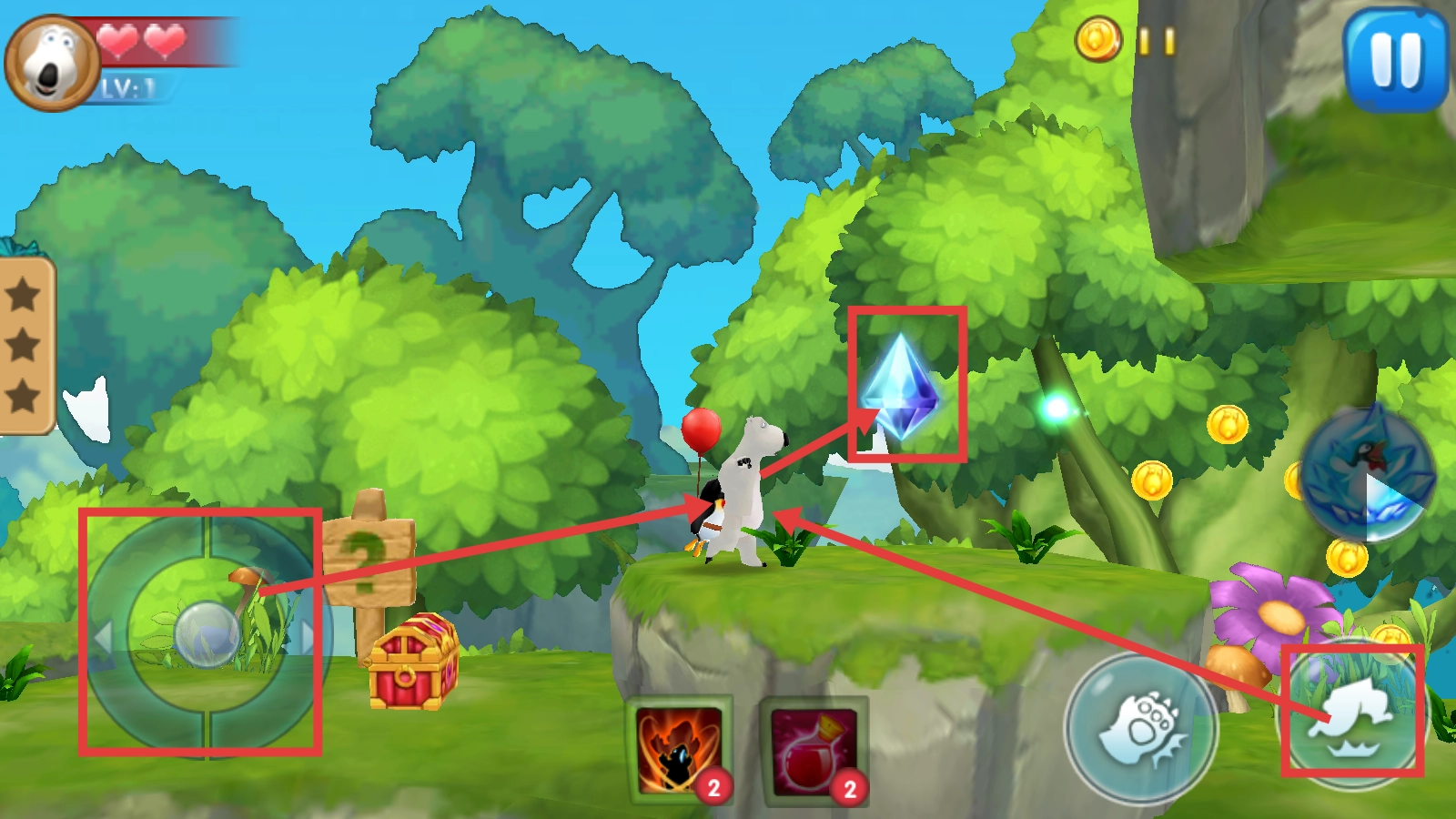 2、游戏中用左侧虚拟摇杆控制移动,尽量收集【蓝色钻石】,利用右下角跳跃按钮跨越地形,探索场景获取资源。