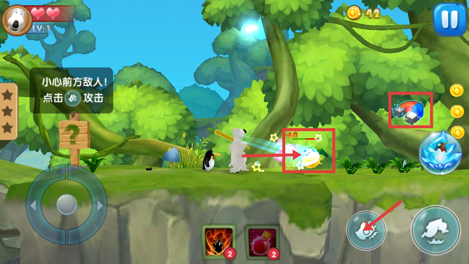 3、遇到敌人时点击攻击按钮发起进攻,收集【磁铁道具】可辅助获取周边资源,注意观察敌人动向,及时战斗或躲避。