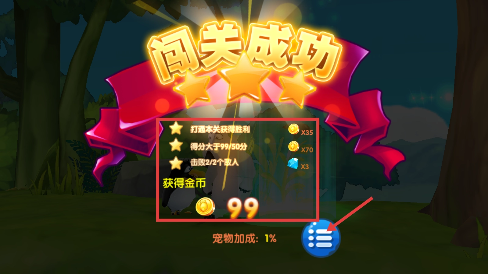 完成关卡挑战后能获取三星奖励,可积累【金币×35/×70】【钻石×3】,注意宠物加成能提高收益,点击下方按钮就能查看后续内容。