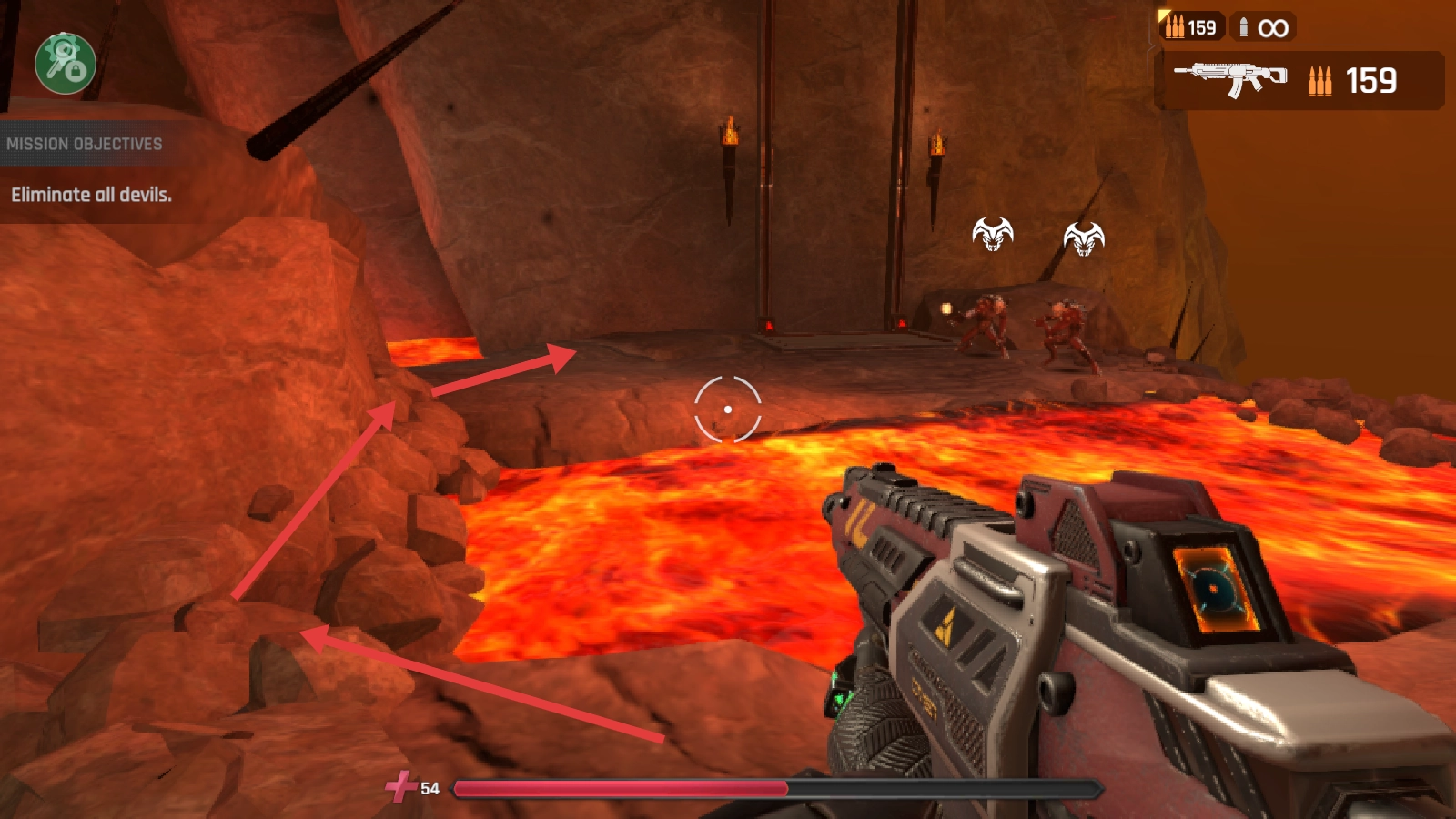 3、在熔岩地形,注意走位避开危险区域,消灭远处恶魔,推进游戏进程。