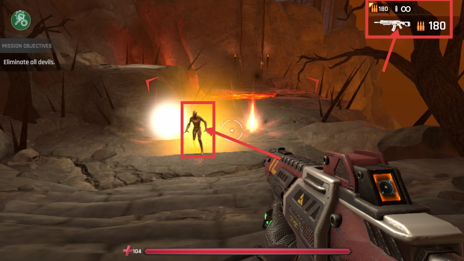 1、任务【消灭全部恶魔】,利用右上角武器弹药【180】,瞄准恶魔精准射击,逐步消灭敌人。