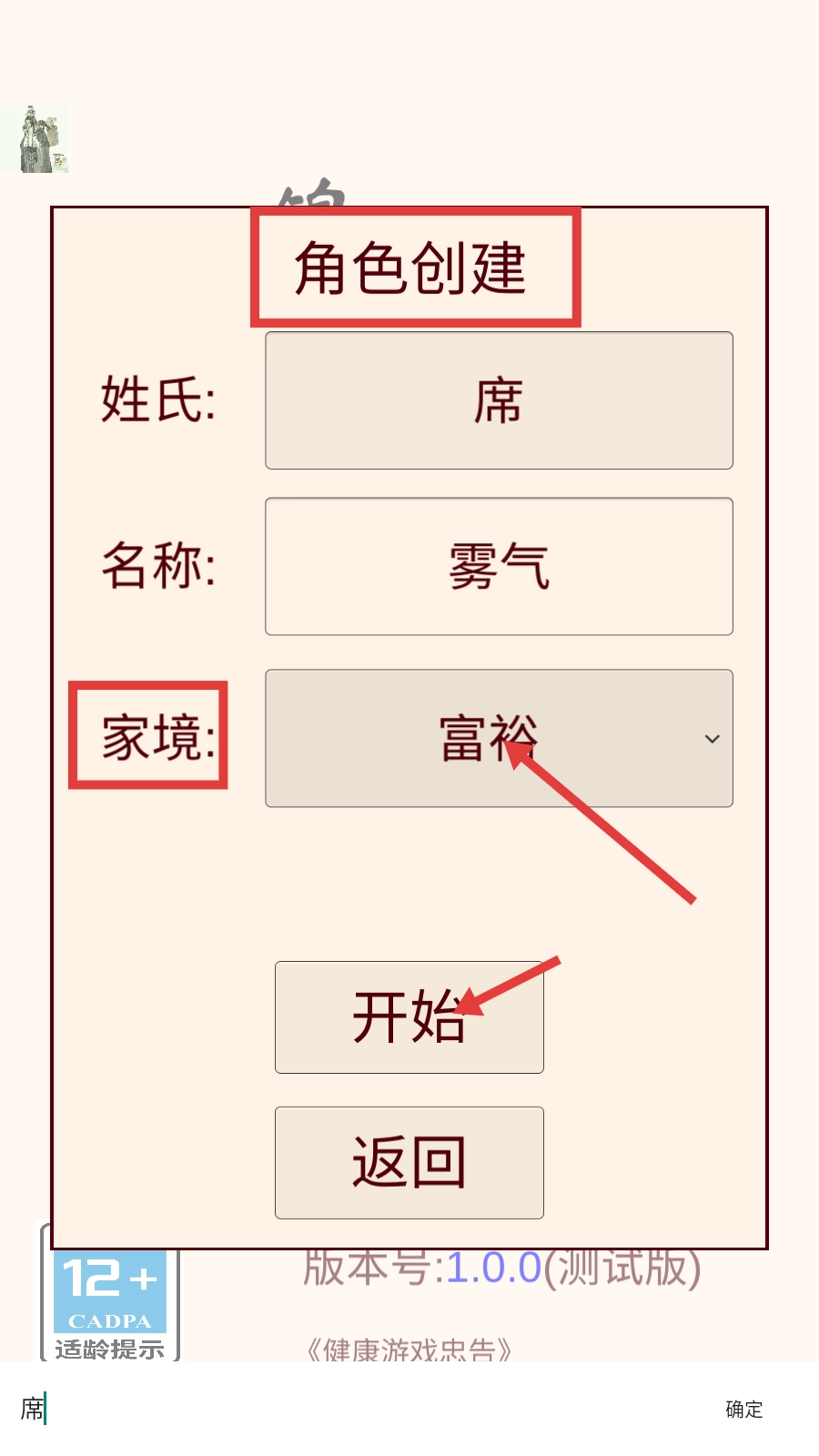 “胡惟庸案”等史实情节被巧妙地融入游戏中,增强了玩家的代入感。游戏中的服饰装束、惩戒器具等元素都经过了细致的考证,再搭配低沉的音效,营造出了诡谲神秘的氛围。此外,该版本还了选单调整功能,简化了晋升流程,让玩家能更顺畅地体验游戏。1、进行【角色创建】时,可选择【家境-富裕】,填写姓氏名称后点击【开始】,进入游戏开启锦衣卫生涯。