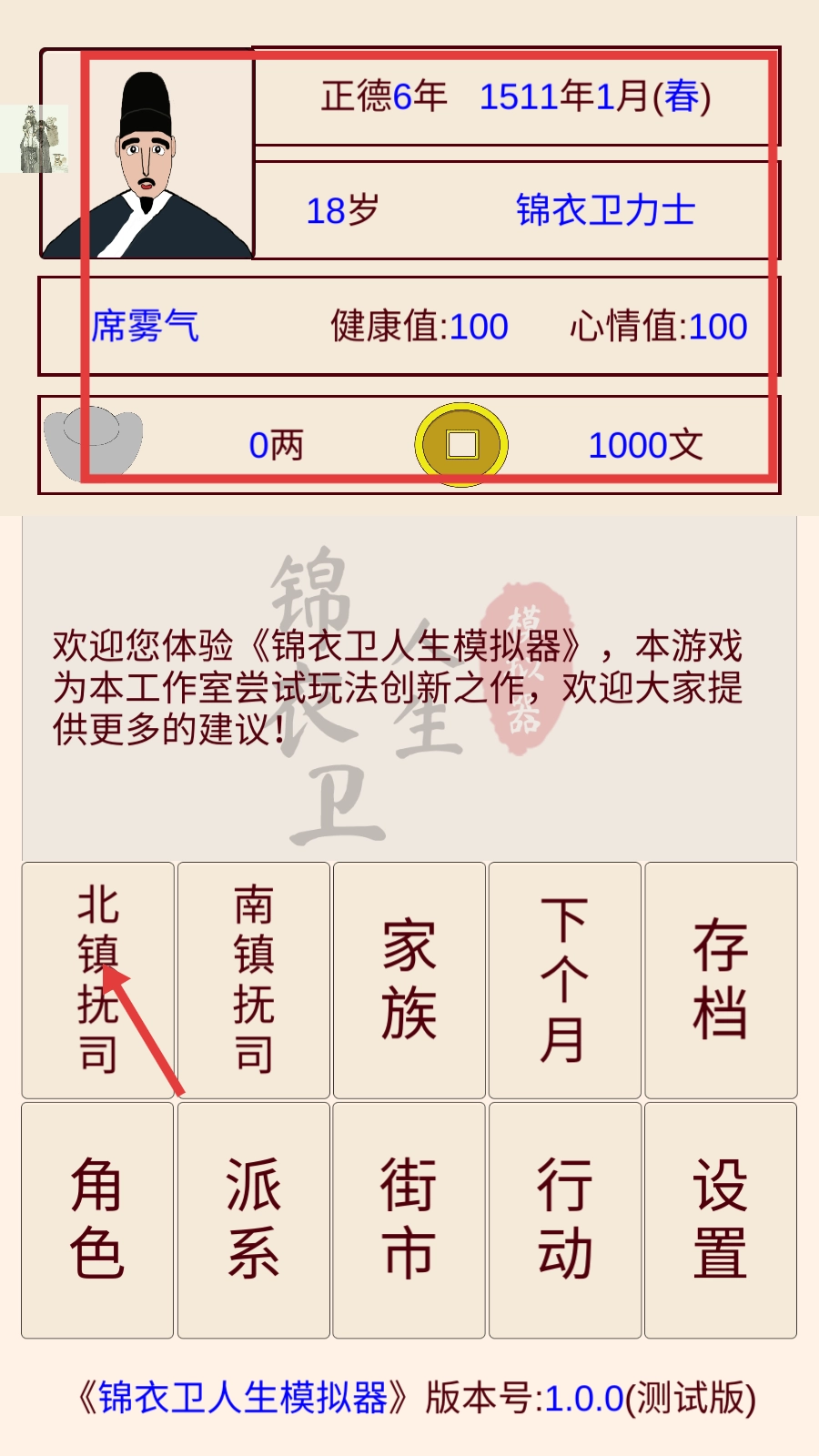 2、进入游戏后,查看角色的健康值、心情值等信息,点击【北镇抚司】,可开启任务相关操作。