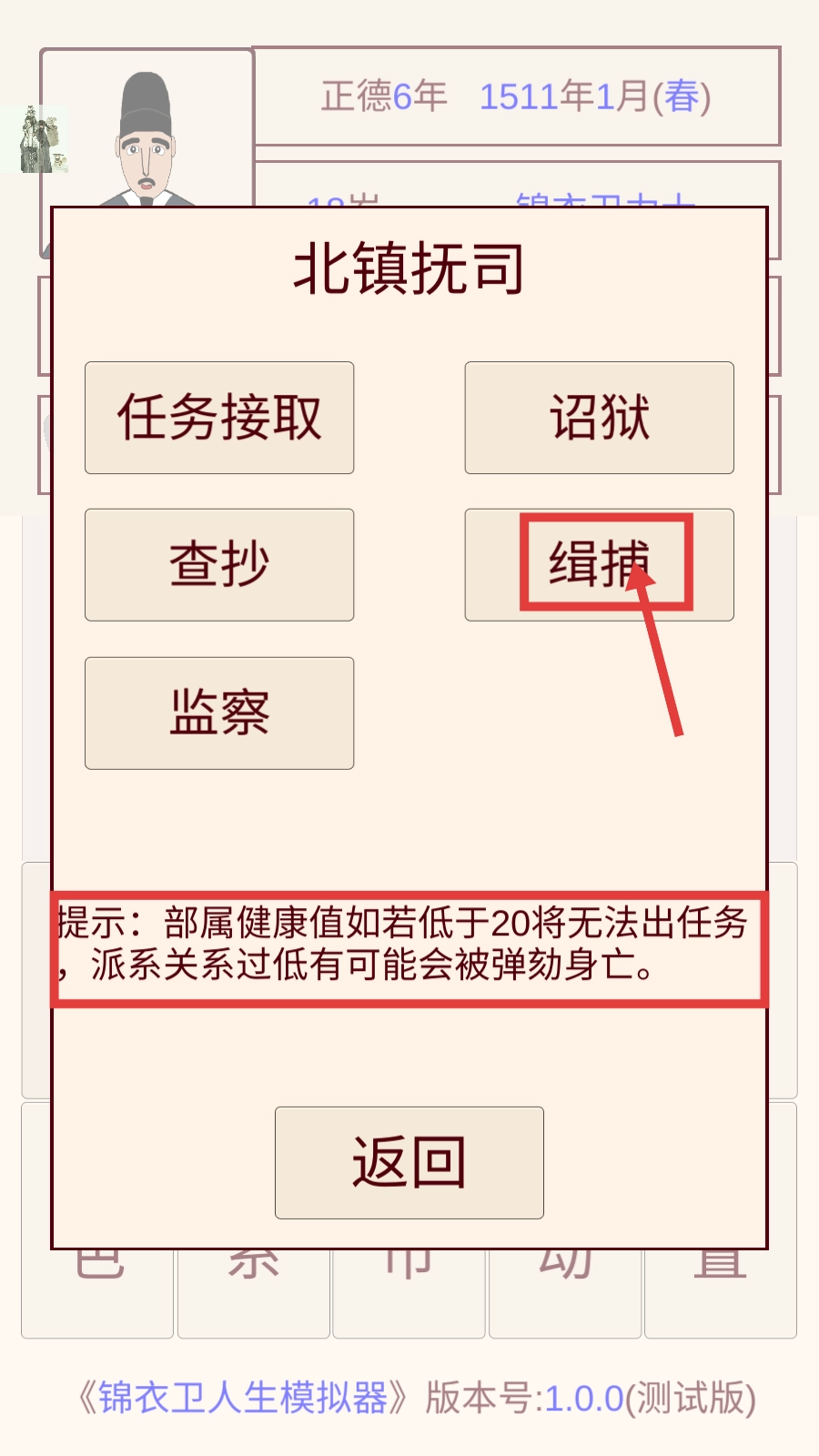 3、在【北镇抚司】中选择【缉捕】任务,需注意部属健康值不可低于20,同时关注派系关系避免被弹劾。