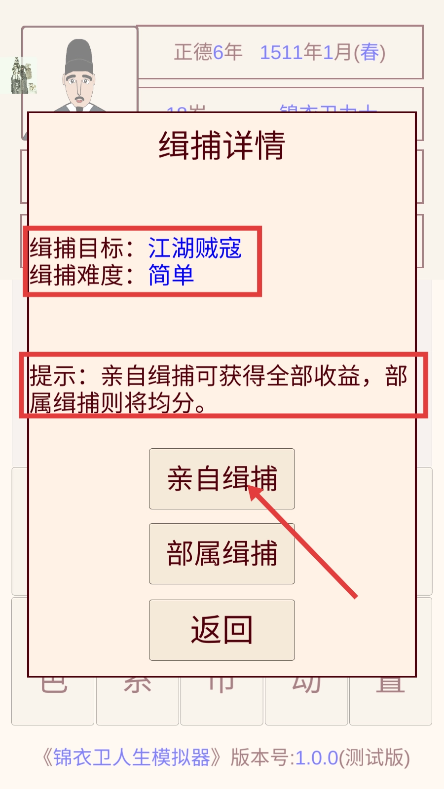 4、缉捕目标为【江湖贼寇】且难度【简单】时,选择【亲自缉捕】可获得全部收益,助力角色发展。