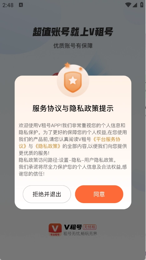 1、用户首先需在本站进行V租号操作,在此过程中查看并同意隐私政策与用户协议。