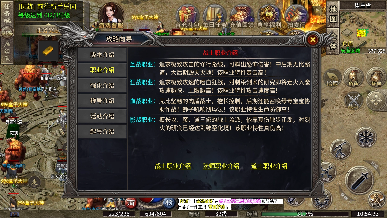 3、血战职业:堪称无比坚韧的肉盾战士,不仅擅长控制,到了后期还能召唤绿毒宝宝来协助作战!其标志性的狮子吼更是响彻整个玛法大陆!该职业最突出的特性便是生命值与防御能力都相当高!