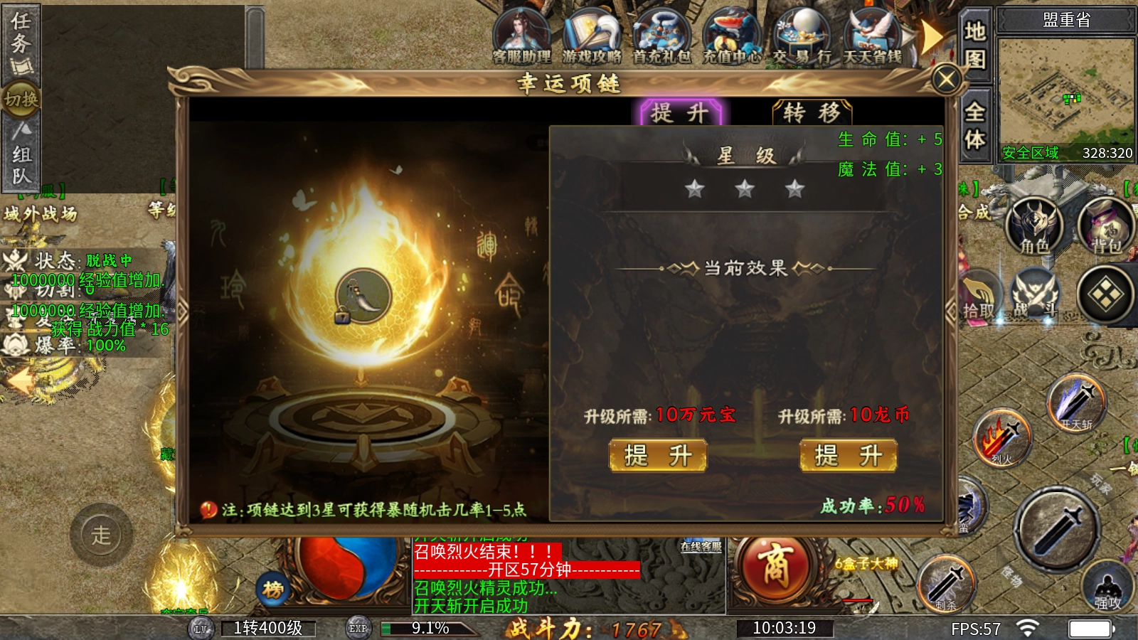 3、幸运项链:消耗元宝或龙币可进行升运操作(运1阶段需10万元宝或10龙币,成功率50%;运2阶段需100万元宝或50龙币,成功率30%;运3阶段需500万元宝或100龙币,成功率5%。建议优先使用龙币升运,因为龙币的消耗成本低于元宝)。另外,更换项链后请务必进行幸运转移!