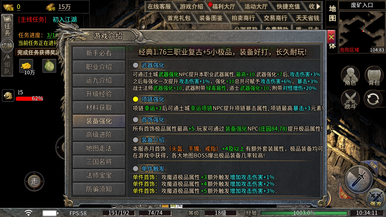玩家可前往土城的武器强化NPC处,对本职业武器进行属性提升,强化等级上限为+10。当武器强化至+7时,可获得攻击伤害+3%的加成;此后每提升一级强化等级,攻击伤害额外增加1%,因此强化到+10时,累计可获得攻击伤害+6%与暴击+3%的综合增益。此外,战士和法师的武器强化至+10后,将附带绿毒属性效果;而道士的武器强化到+10,则会获得对怪物增伤20%的特殊属性。