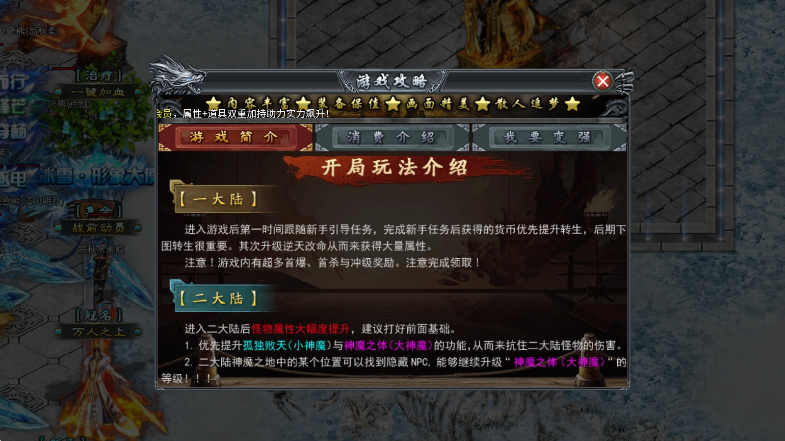 6、踏入三大陆后,特色机制的BOSS副本将正式解锁。建议优先升级造化魔神,尽快抢占魔神之地!这里有丰富多样的魔器,能大幅提升各项属性;同时新增了装备投保功能,从此无需担心装备被他人爆落!