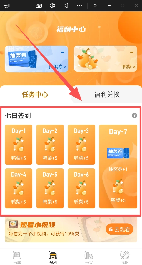 进入 “福利” 中心,通过每日签到和观看小视频来积累“鸭梨”,为后续阅读储备“弹药”。